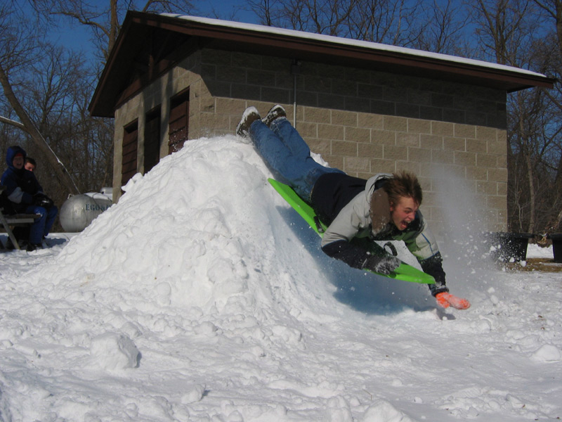 It looks like it might be a hard landing as Mike sleds over this small pile of snow.