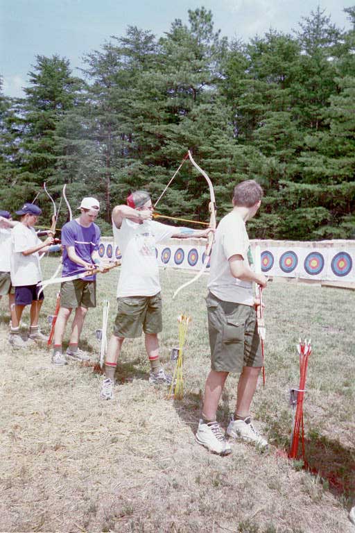 Troop 1417's scoutmaster and assistant scoutmaster test their skills at the archery range.