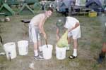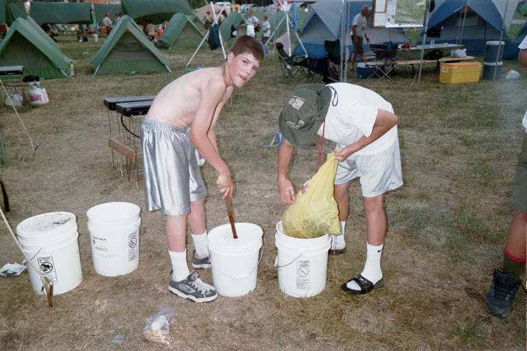 Every Scout was responsible for his own laundry. One of the popular ways do get it clean was to use the bucket and plunger method.