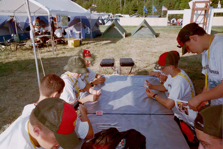 The Scouts of Troop 1417 were always doing something. He a few take a break to play cards at the campsite.