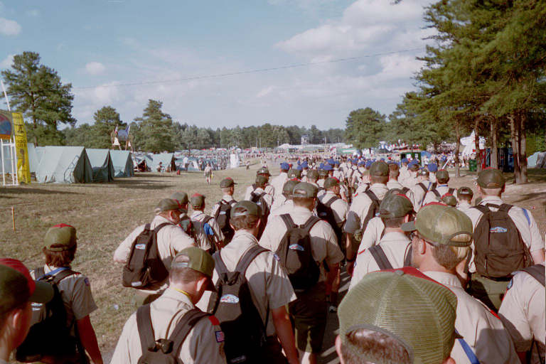 Troop 1417 moves out to get in line with other troops from Subcamp 14 as they prepare to leave for the Jamboree's first arena show.