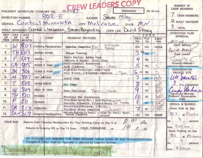 Here is a copy of the crew's itinerary. Notice that Troop 68 took a 68 miles trek.