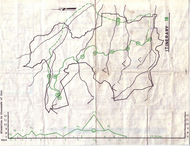 This is the flip side of the itinerary showing a rough map of the trek, along with a mileage and elevation chart.