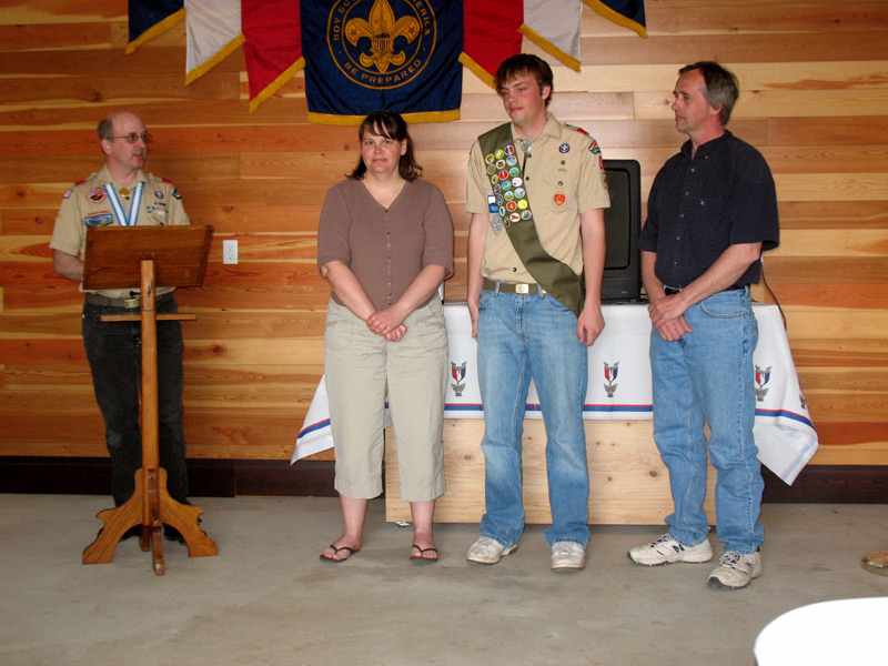 Scoutmaster Steve speaks as Mike's parents, Karla and Mark, stand by his side.
