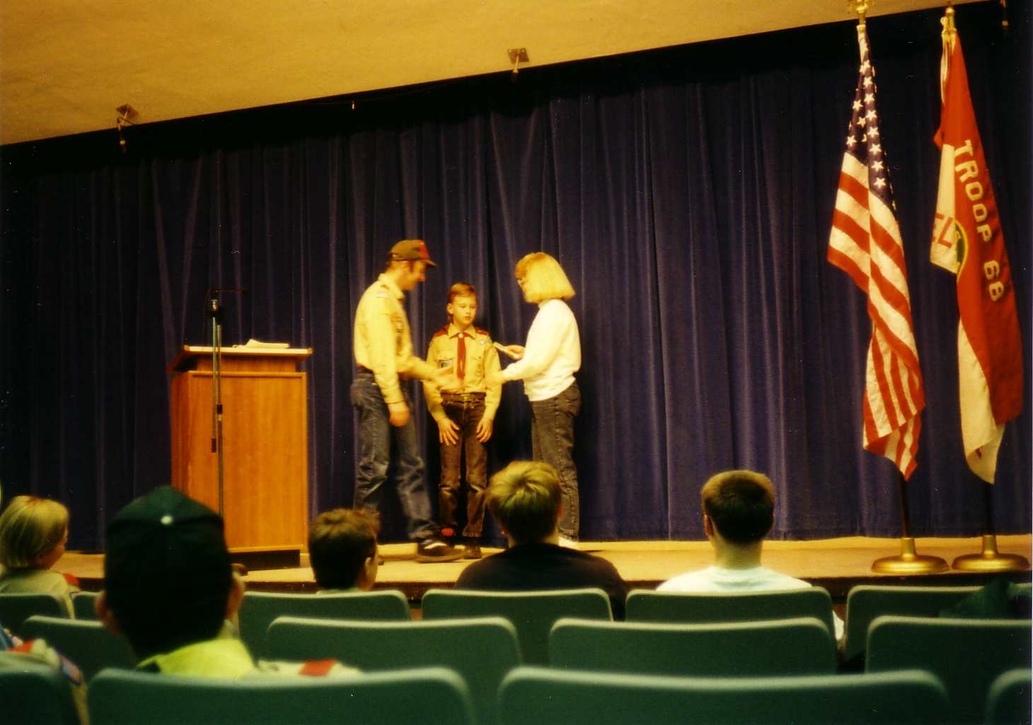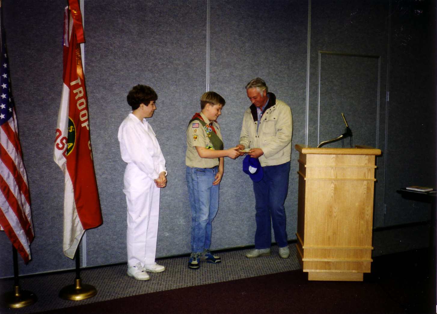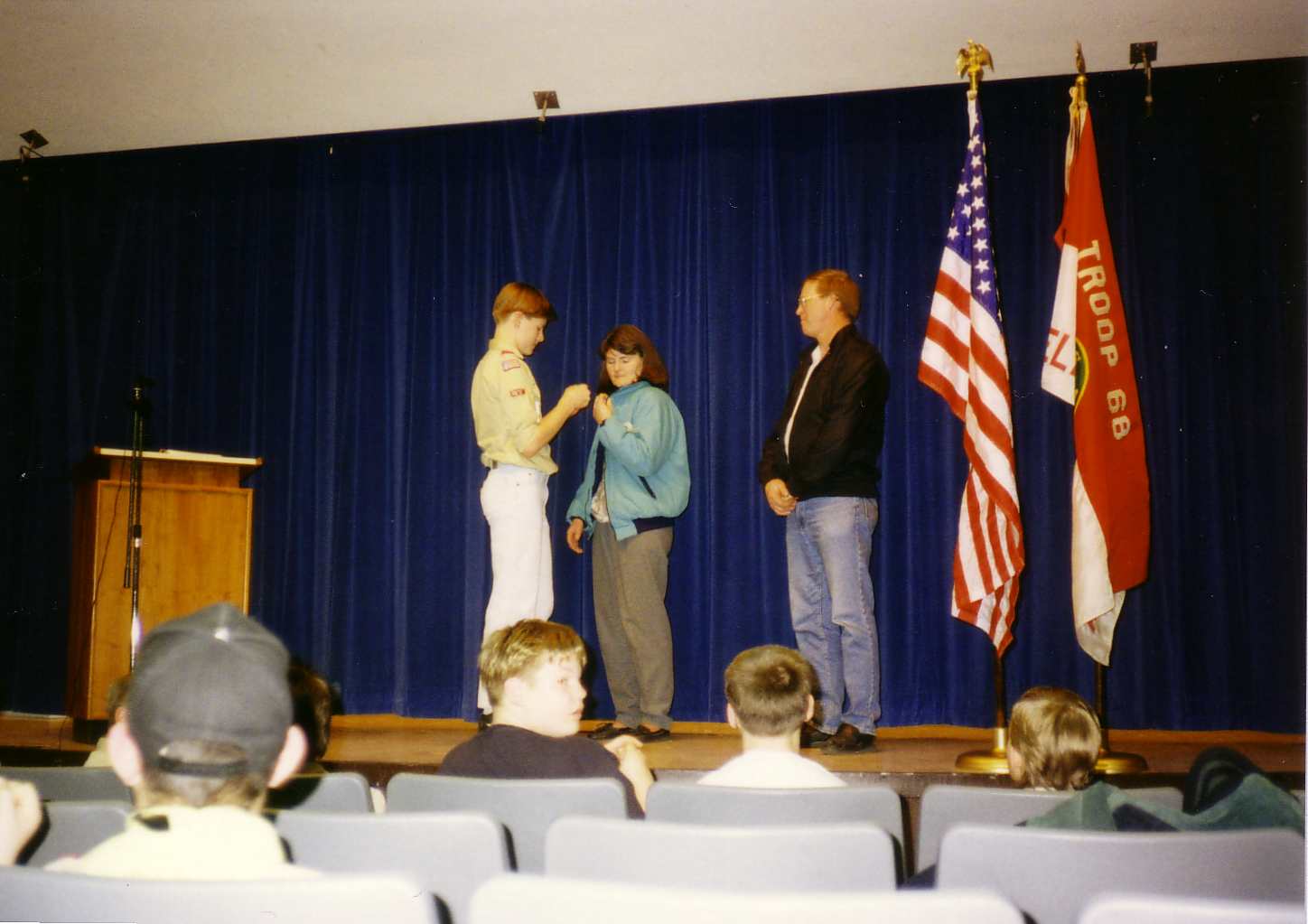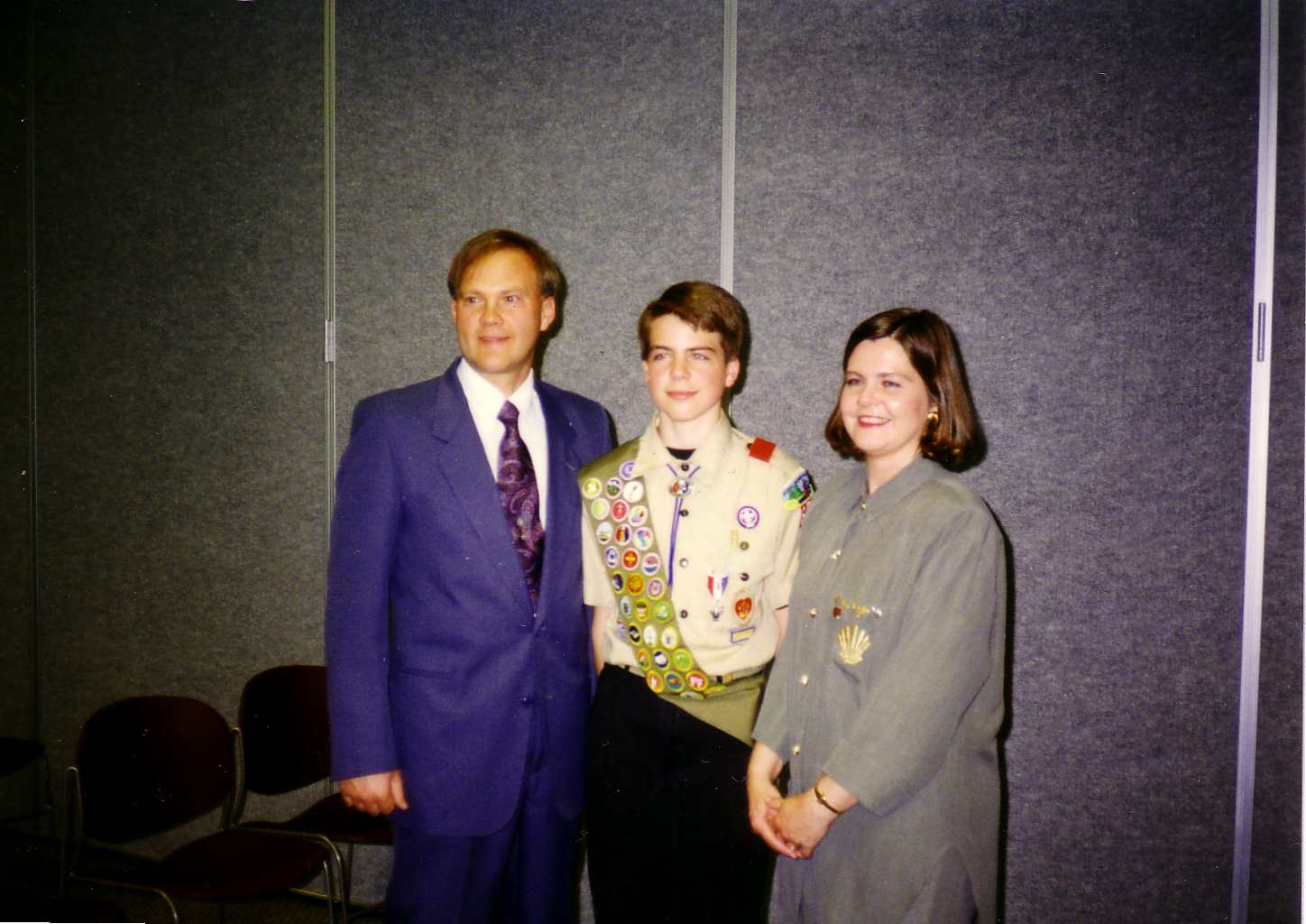![]() Tom receives his Eagle Award as his parents stand beside him. |