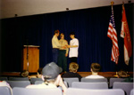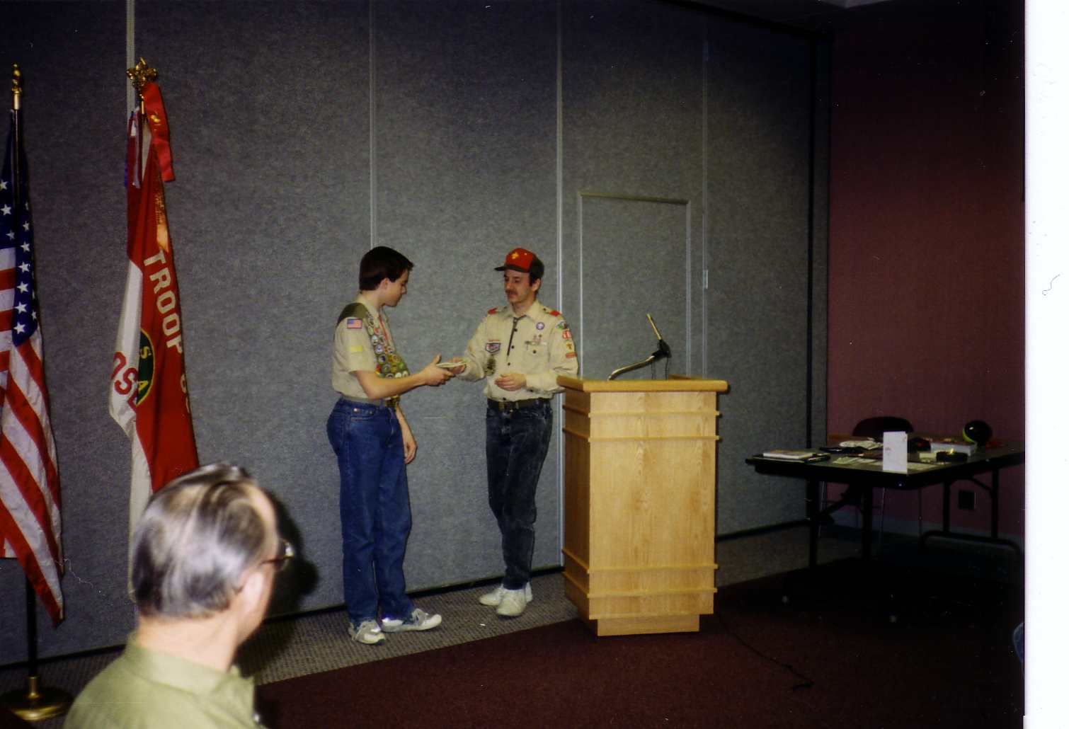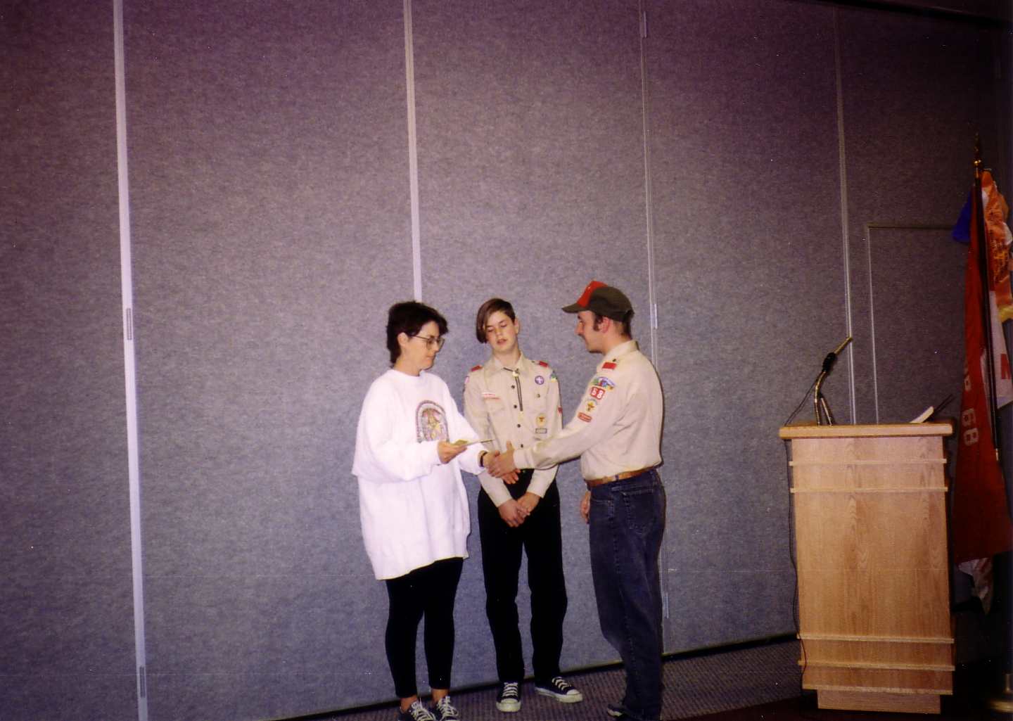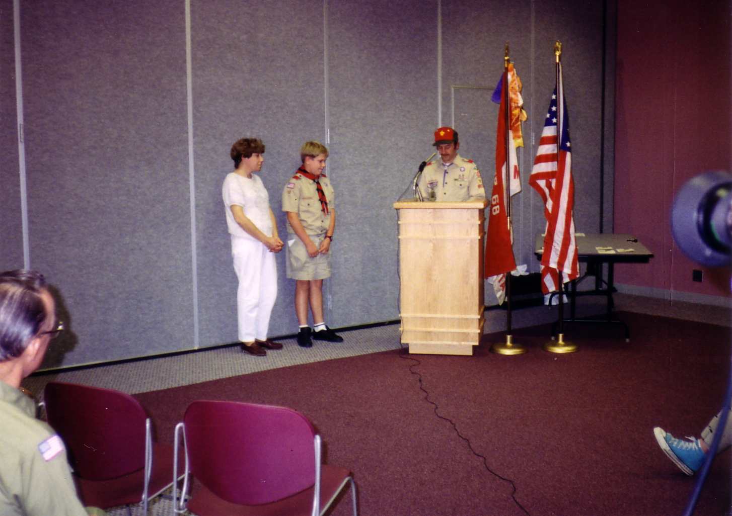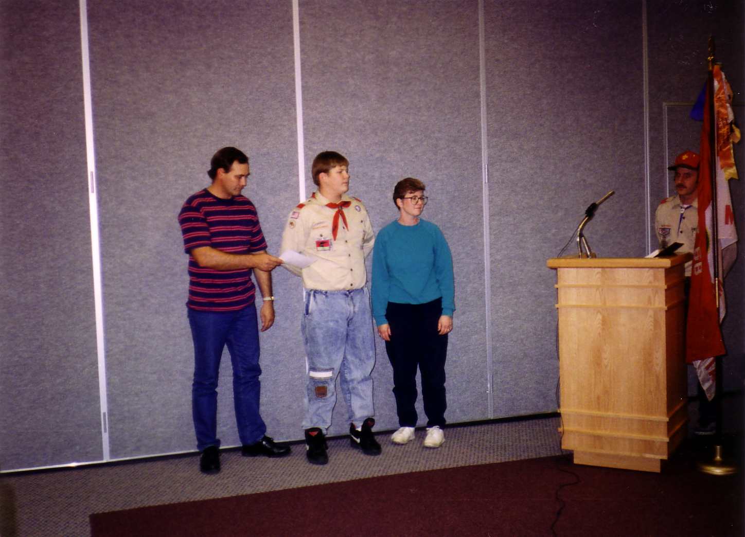 ![]() Tom receives his Eagle Award as his parents stand beside him. |